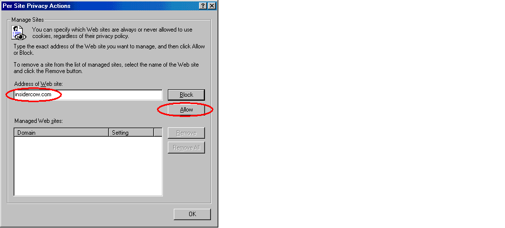 1. What patterns of inside trading is really a basis for serious consideration of a specific stock? Insiders may file SEC Form 4 for stock purchase because of reasons other than they think their stock may go up: they may have company stock compensation, or they may have to excises their stock options that are expiring soon. Generally, we should look for stocks that have several insiders, better if CEO or CFO is included, buy the stock at the market price within a short period of time, say 3 days. Each transaction should have a meaningful amount of shares and total proceeds, e.g., more than 500 shares and $1000. Further, check how many stocks the insiders have already own. If the transaction is the insider's first purchase, that may be because he/she just joined the company and is required to acquire some stock. Other than the transaction itself, investors should also check if the price has already moved a lot after the insider buy and if the stock itself is liquid so that a big transaction won't move the market badly. An example is CRAY. On 7/29/04 2:26pm, while the stock was trading at $3, InsiderCow showed the company's CEO and CFO had bought 45,000 shares in separate transactions. The next day the stock closed 6% higher. The next Monday rumor began on the street that IBM was going to buy CRAY for $6 a share cash, and the stock closed at $3.43, a 14% gain in two trading days. For more examples please refer to our homepage. 2. What patterns of selling indicate a problem with a stock? Insiders sell for different reasons. Bill Gates was continuing selling MSFT not because he's pessimistic about the stock but simply because he had too much stocks and he needed more cash. However, when several key insiders dump the stock continuously in a short period of time, each with big amounts, that may be a warning signal. Especially, avoid at any time stocks that have huge multiple insider sells. 3. Why does it keep making me re-authorize even though I've already logged in? Some browsers won't allow unknown websites to store cookies, which is used by InsiderCow.com to store user credentials. You need to tell the browser to allow cookies set by InsiderCow.com. For Internet Explore 6.0, follow the below 6 steps: